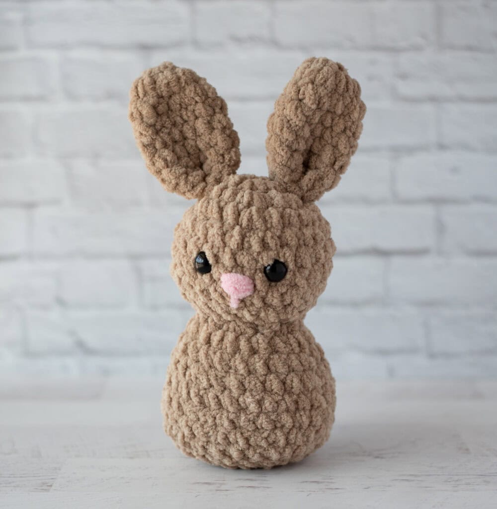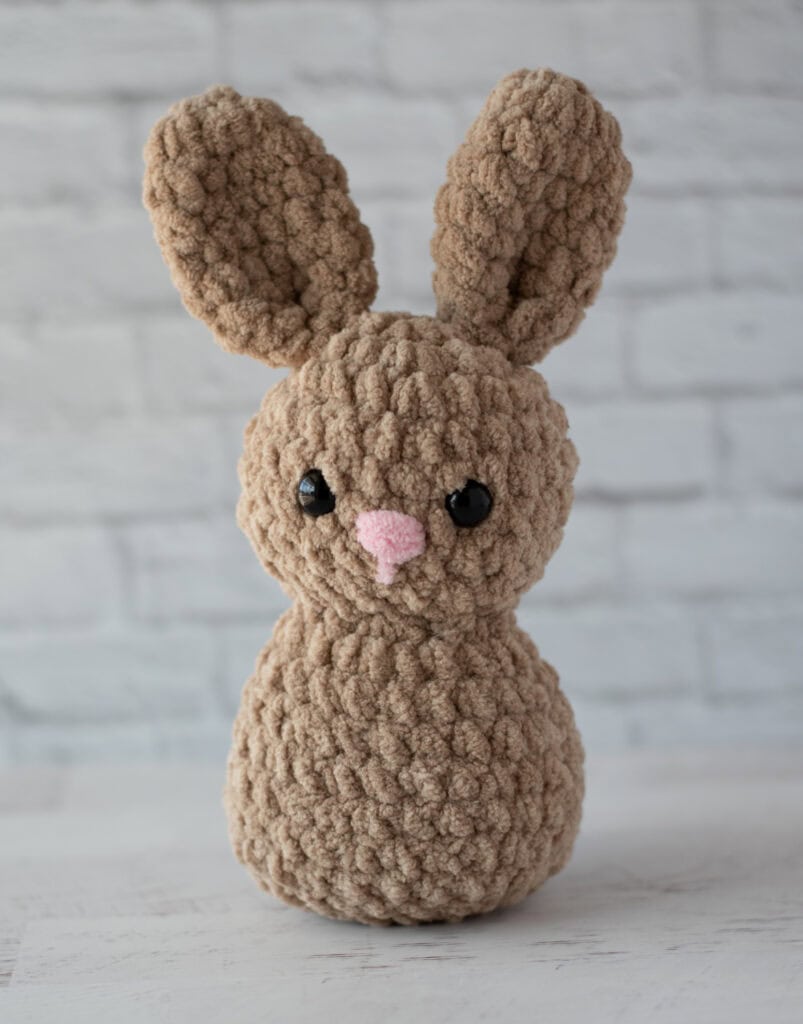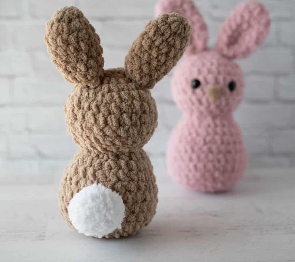 This bunny crochet pattern was designed using super bulky (#6) chenille-style yarn.
