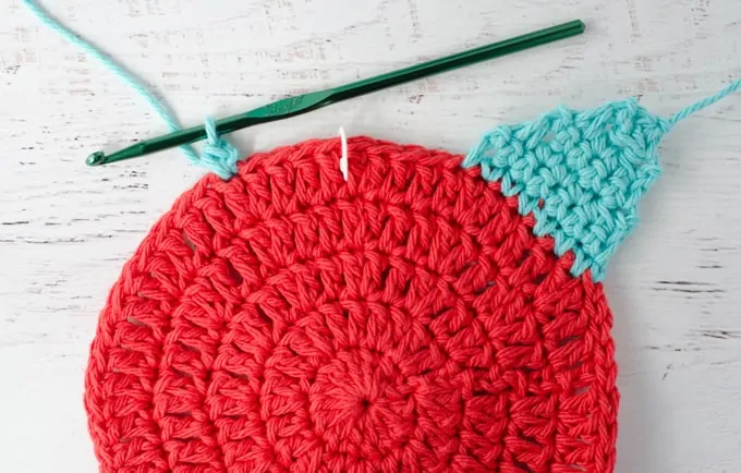 Now, you will stitch the 1st inner ear. Each ear has 7 sc and there are 8 stitches in between the ears. To get to the proper spot, with red, slip stitch in the next 4 st, changing to blue in the last sl st.
