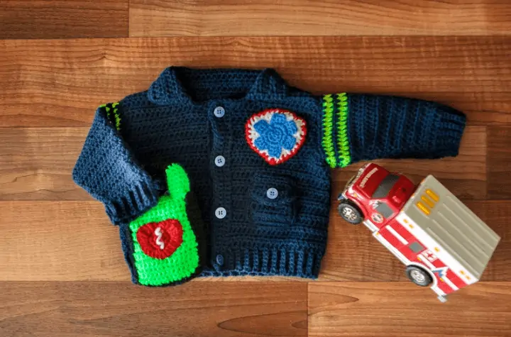I think this little paramedic sweater is just adorable! There are also some good suggestions in the description about making the yarn colors match your local town colors. What a fun way to support your hometown while making your little paramedic wannabe at home happy!