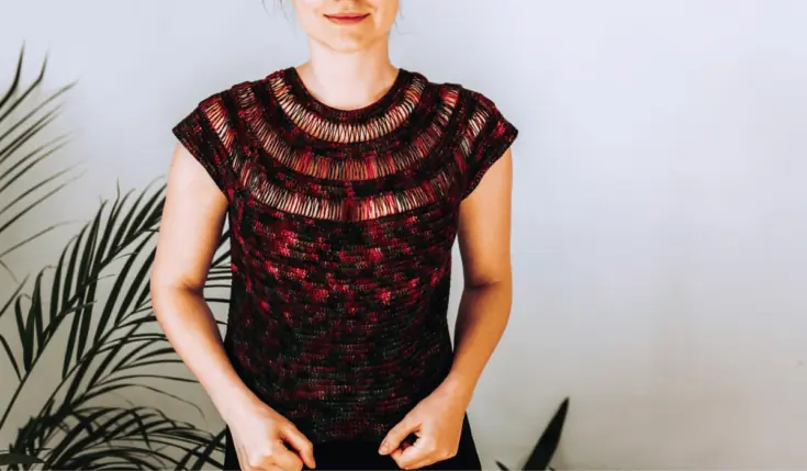 I love this lacy design up top. This pattern is made with lightweight yarn that's perfect for anyone who wants a cooler shirt for all the warmer days. Or, if you're someone who likes to wear a lighter shirt under your jacket in the fall or if you tend to get too warm, this is a great option.