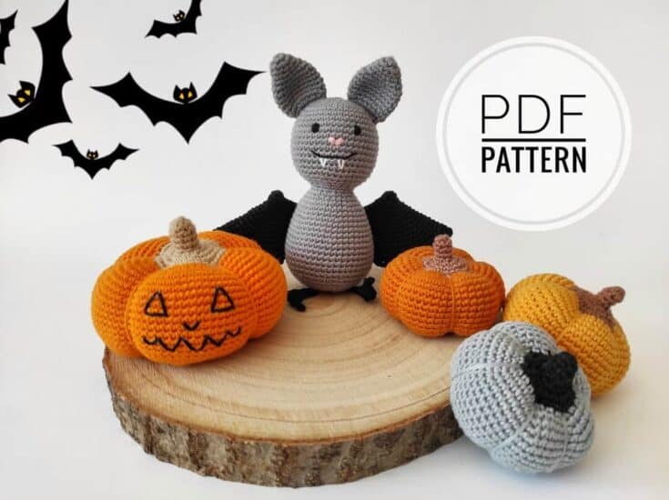 This bundle of Halloween amigurumi patterns includes an adorable crochet bat and a crochet pumpkin! The black embroidery floss that turns this pumpkin pattern into a jack-o-lantern really adds some fun to this pattern.